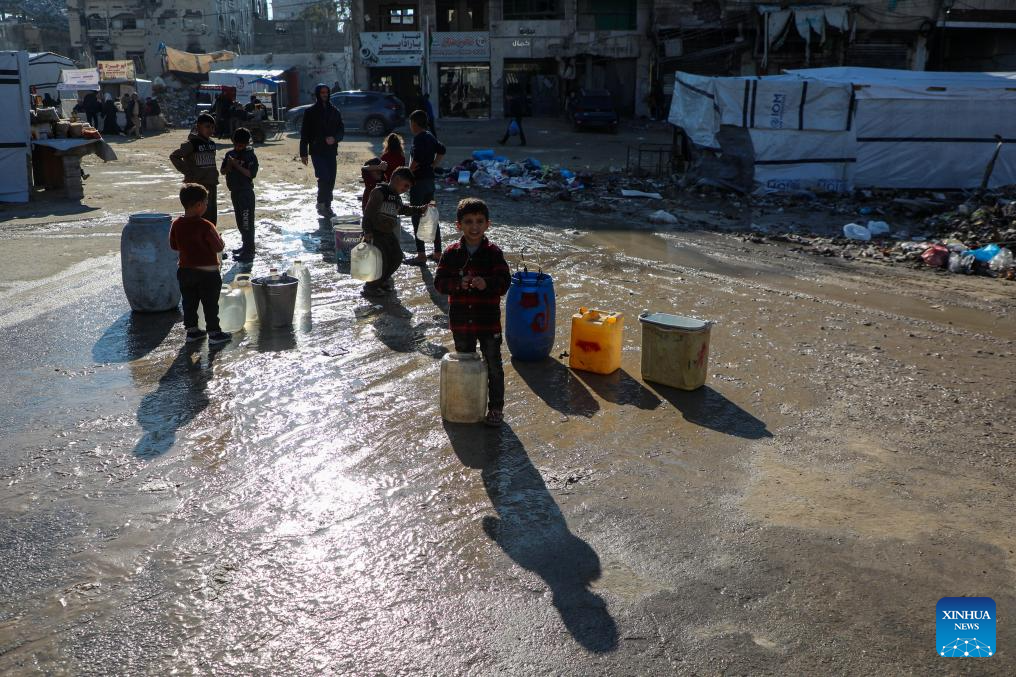 Palestinian children transport water with containers in Gaza City, Dec. 18, 2025. (Photo by Rizek Abdeljawad/Xinhua)