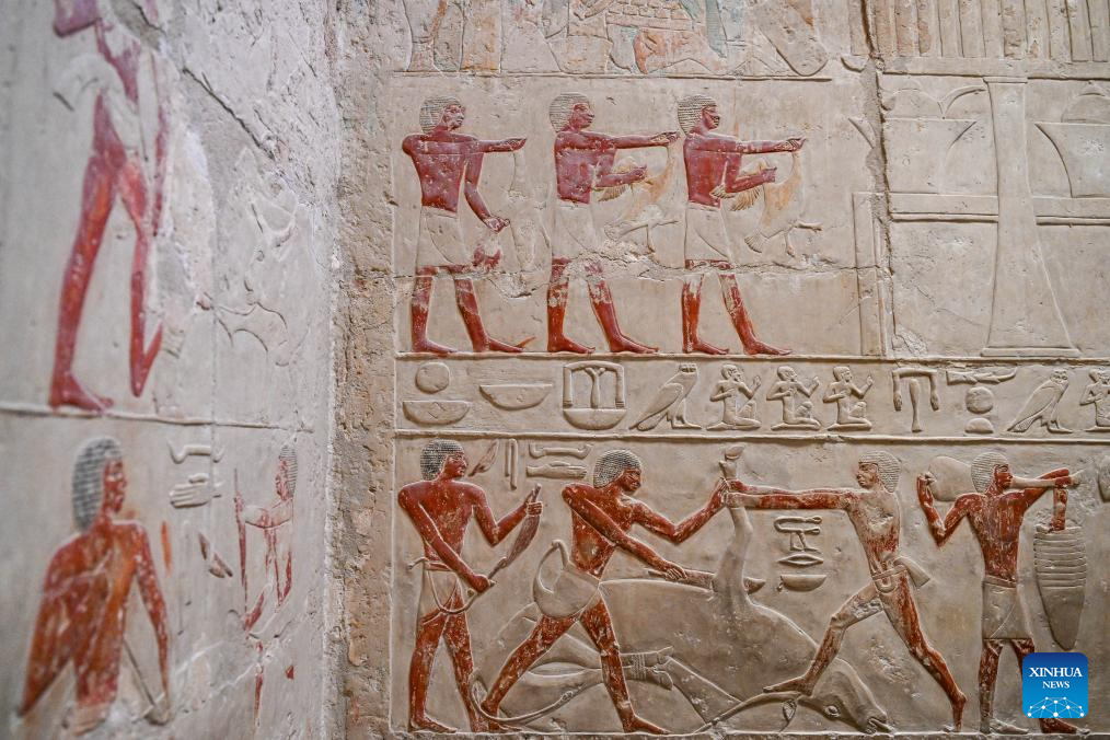 Photo taken on Dec. 18, 2025 shows colored relief paintings inside a tomb in the Saqqara necropolis, Giza, Egypt. (Xinhua/Xin Mengchen)