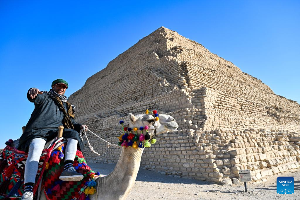 A man rides a camel in front of the Step Pyramid in the Saqqara necropolis, Giza, Egypt, Dec. 18, 2025. (Xinhua/Xin Mengchen)
