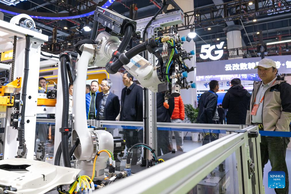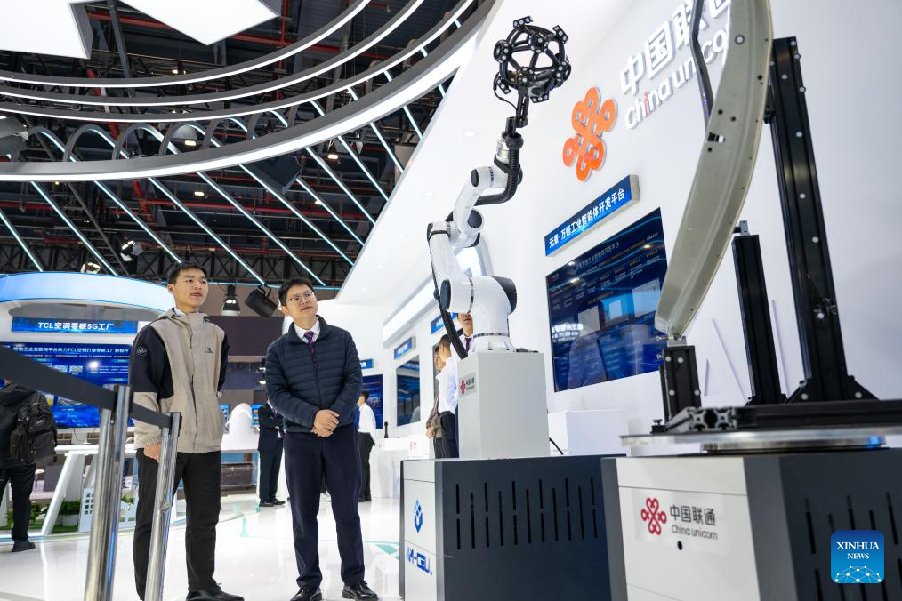 Visitors view a workstation for automobile components manufacturing during the 2025 China 5G + Industrial Internet Conference in Wuhan, central China's Hubei Province, Nov. 21, 2025. The conference kicked off here on Friday and will run through Sunday. (Xinhua/Xiao Yijiu)