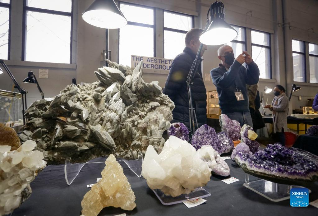 Visitors look at gemstones displayed during the Gem and Mineral Show in Vancouver, British Columbia, Canada, on March 25, 2022. The three-day show features about 100 vendors from across Canada with their gem, mineral and rare fossil collections. (Photo by Liang Sen/Xinhua)