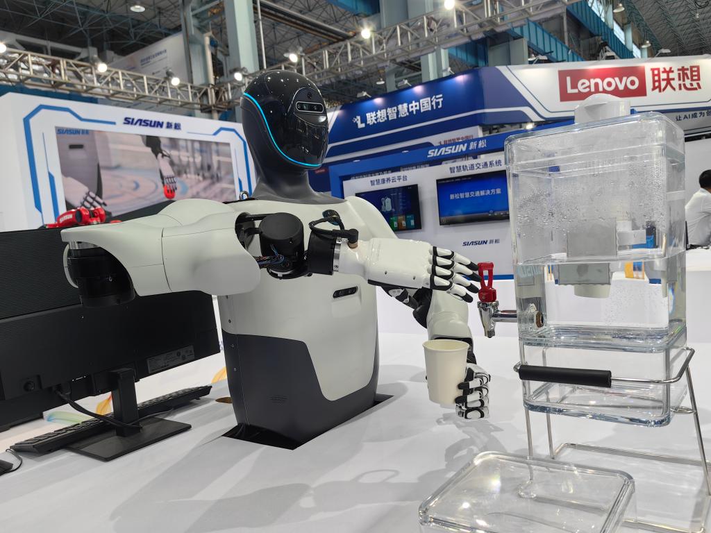 在沈阳新松公司展位,今年8月份刚刚发布的一款具备多模态交互能力的人形机器人吸引了众多观众驻足。记者走上前去,目睹了其“灵巧手”倒水的全流程。“给我接一杯水”,接收到指令的机器人,通过视觉识别精准定位饮水机和水杯位置,自主规划路径,双臂协同完成接水、端送等一系列动作,最终将水杯平稳递至记者手中。整个过程流畅、稳定,展现了其高精度定位与智能决策能力。