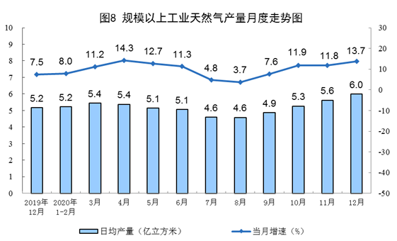 天然氣生產(chǎn)持續(xù)快速增長。12月份,生產(chǎn)天然氣187億立方米,同比增長13.7%,增速比上月加快1.9個百分點(diǎn);日產(chǎn)6.0億立方米,環(huán)比增加0.4億立方米。2020年,生產(chǎn)天然氣1888億立方米,比上年增長9.8%,連續(xù)四年增產(chǎn)超過100億立方米。