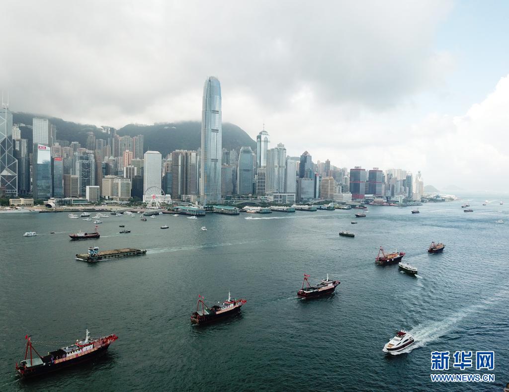 7月1日,插滿旗幟的漁船在香港維多利亞港巡游(無人機照片)。新華社記者 李鋼 攝