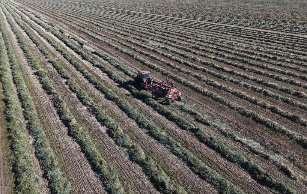 11月1日,工人驾驶拖拉机在甘肃山丹马场二场田间翻晒燕麦草(无人机照片)。