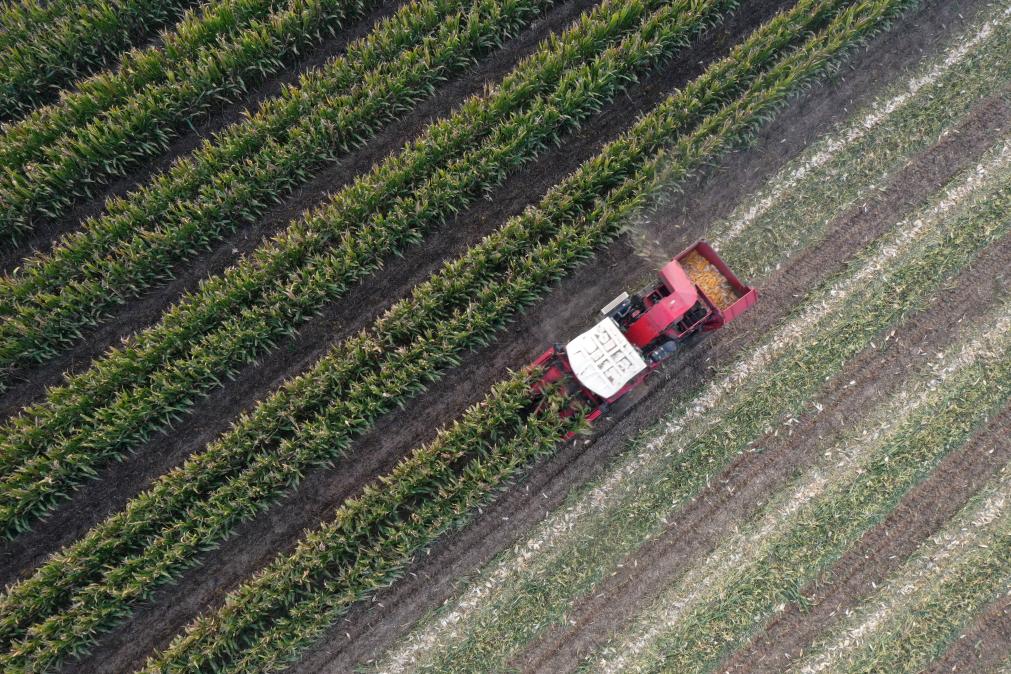 10月30日,农机手驾驶联合收割机在河南省沁阳市崇义镇南范村田间收获玉米(无人机照片)。