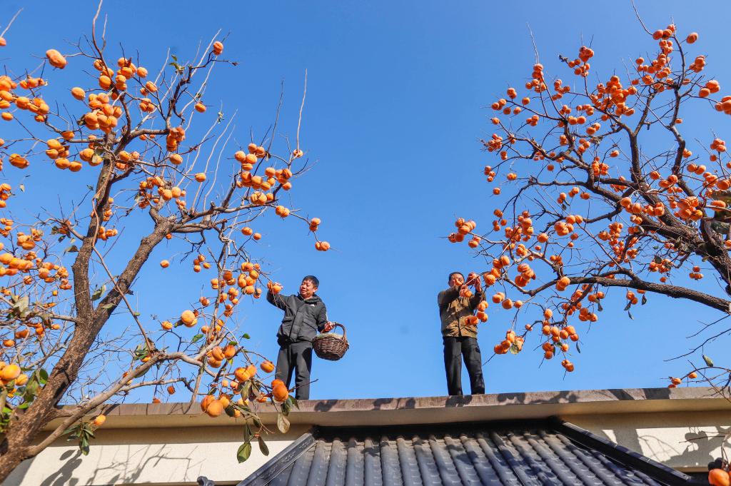 11月1日,河北省遵化市娘娘庄镇芦各寨西山村农民在庭院采摘柿子。