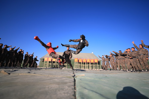 ????武警新疆總隊某機動支隊特戰一中隊組織官兵開展搏擊訓練(10月31日攝)。新華社發(張文 攝)