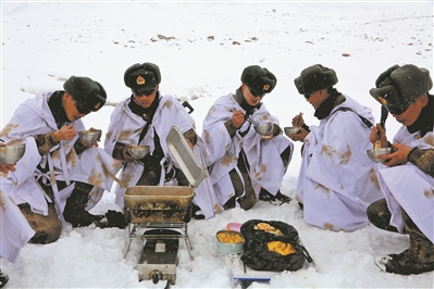 ????邊關冷,保障暖。某邊防團四級軍士長張震說:“在零下20多攝氏度的山尖尖,面條吸溜到肚里,胃里暖暖的,身上熱熱的!”(楊仁偉、孫興維)