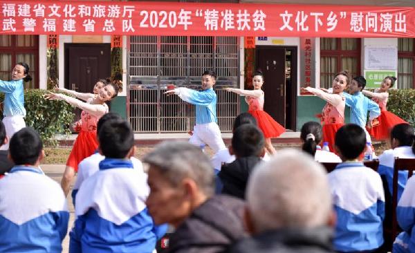 ????為學習貫徹黨的十九屆五中全會精神,推動農村文化建設發展,近日,武警福建總隊“文藝輕騎隊”聯合省市文旅部門歌舞團到寧德市壽寧縣上黨村和龍巖市長汀縣晨光村開展“精準扶貧、文化下鄉”專項慰問演出,給村民們帶去了歡聲笑語,豐富了村民們的文化生活。