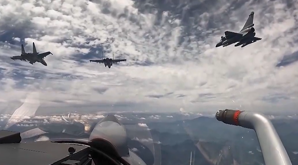 蓝方歼-10战机飞行员沉着应对,利用机载电磁干扰设备和战术机动摆脱“敌”方跟踪锁定,并根据战场态势变化,不断调整接“敌”占位,与红方展开激烈对抗。