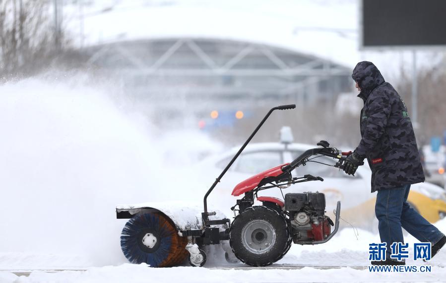1月28日,在沈陽市渾南區,一位工作人員在奧林匹克公園清掃積雪。