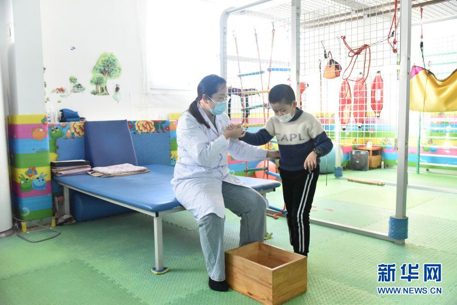 在哈爾濱博能中醫門診部,劉雨晴為腦癱兒童進行康復訓練(2月2日攝)。