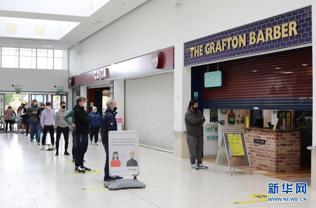 5月10日,人們?cè)趷蹱柼m首都都柏林一家重新恢復(fù)營(yíng)業(yè)的理發(fā)館外排隊(duì)。