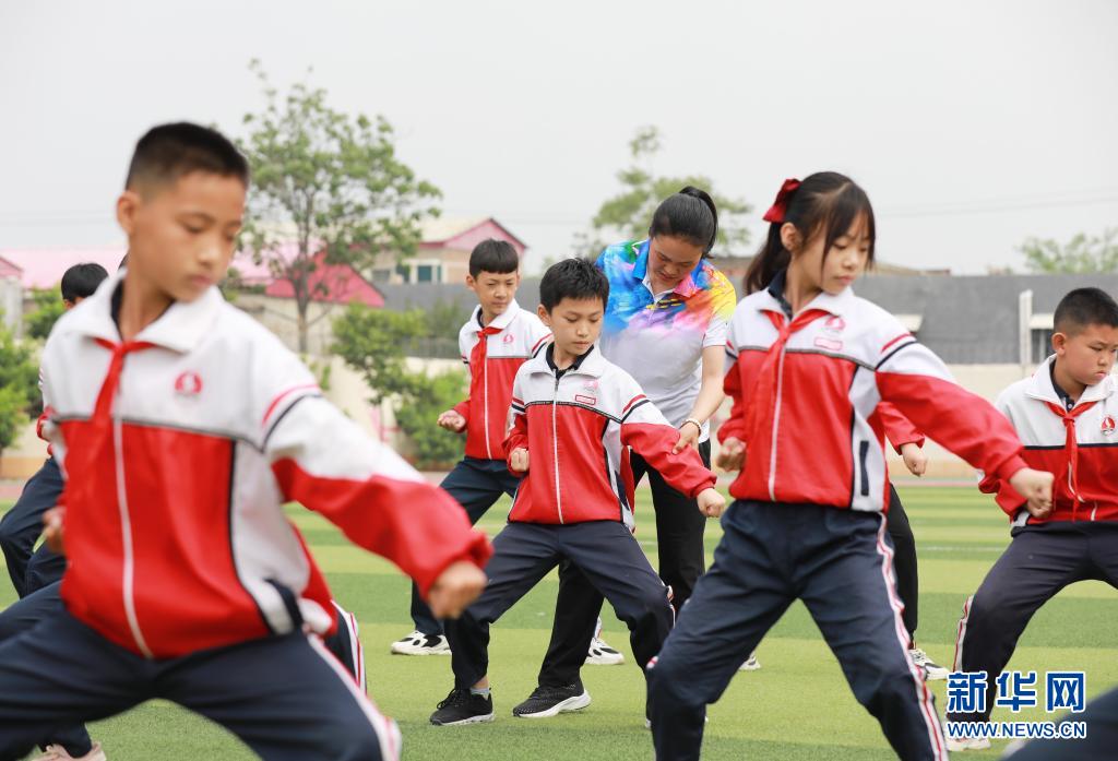 5月19日,邢臺市內丘縣實驗小學學生在體育教師的指導下練習武術操。