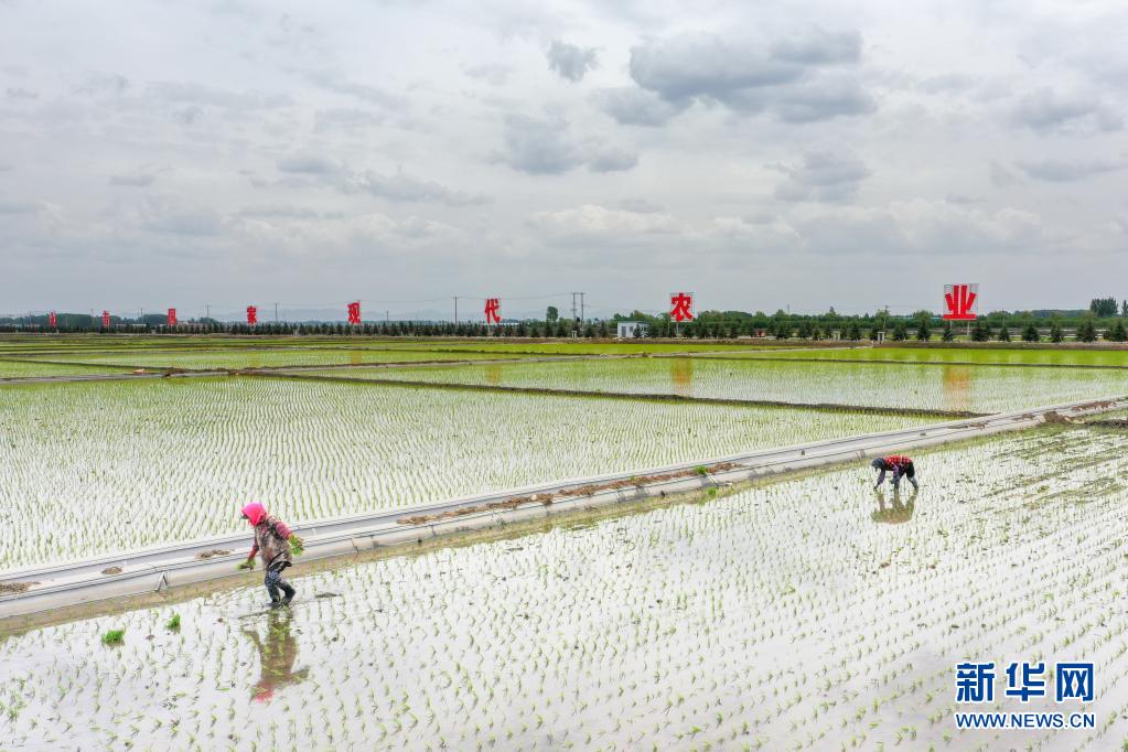 5月26日,在吉林省吉林市永吉縣萬(wàn)昌鎮(zhèn)宇豐米業(yè)2萬(wàn)畝高標(biāo)準(zhǔn)水田基地,農(nóng)民進(jìn)行水稻補(bǔ)苗工作(無(wú)人機(jī)照片)。