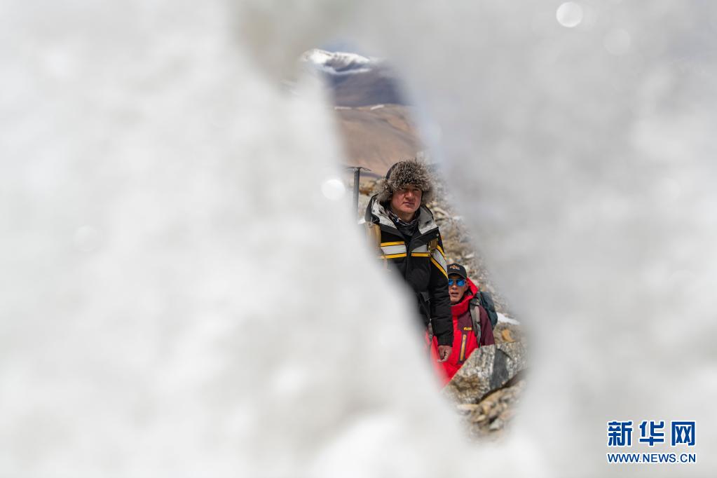 別克米爾扎·圖爾達(dá)力(前)和同伴庫(kù)爾班巴依·努爾麥麥提在適應(yīng)性練習(xí)中從冰川旁經(jīng)過(5月16日攝)。新華社記者 胡虎虎 攝