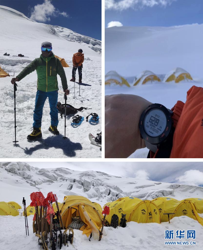拼版照片:上左為別克米爾扎·圖爾達力在提供慕士塔格峰登山協作服務時,由C1營地前往C2營地途中(2019年7月24日攝),上右為別克米爾扎到達慕士塔格峰海拔6200多米的地點(2019年攝);下圖為別克米爾扎拍攝的C1營地(2019年6月22日攝)。新華社發