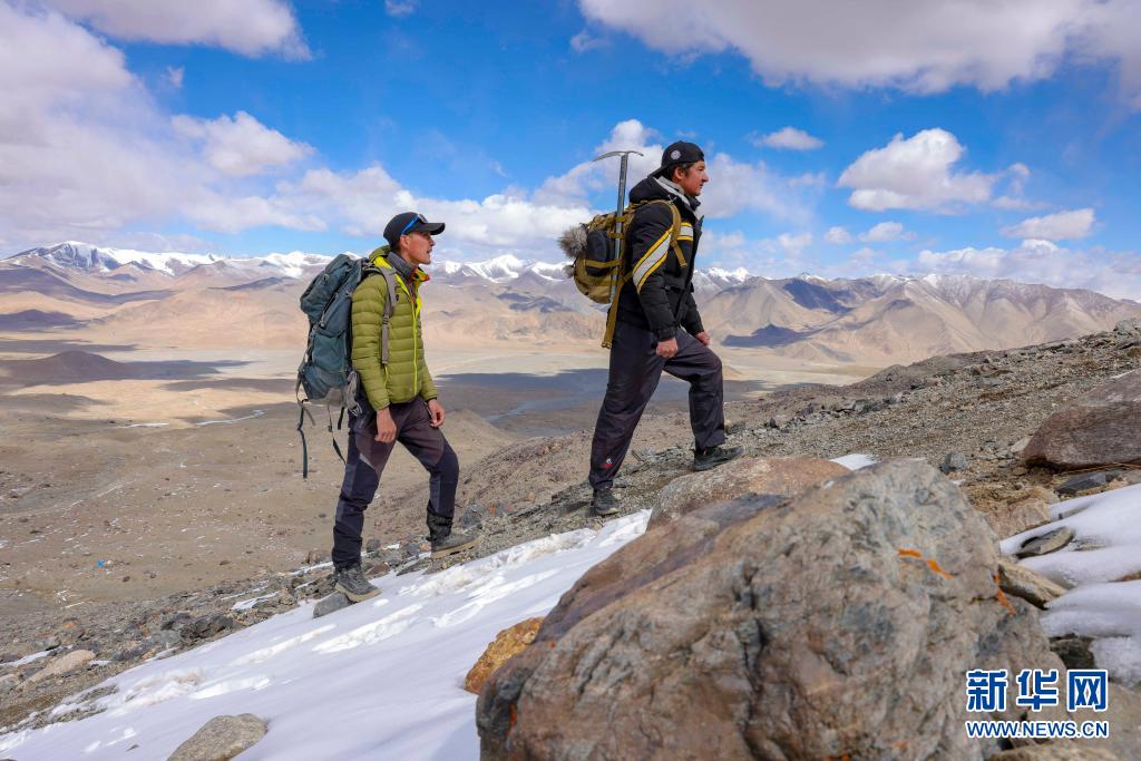 別克米爾扎·圖爾達力(前)和同伴庫爾班巴依·努爾麥麥提行走在山間,準備進行適應性練習(5月15日攝)。每年登山季到來前,他們會選擇天氣晴好時進行訓練,適應環境。新華社記者 胡虎虎 攝