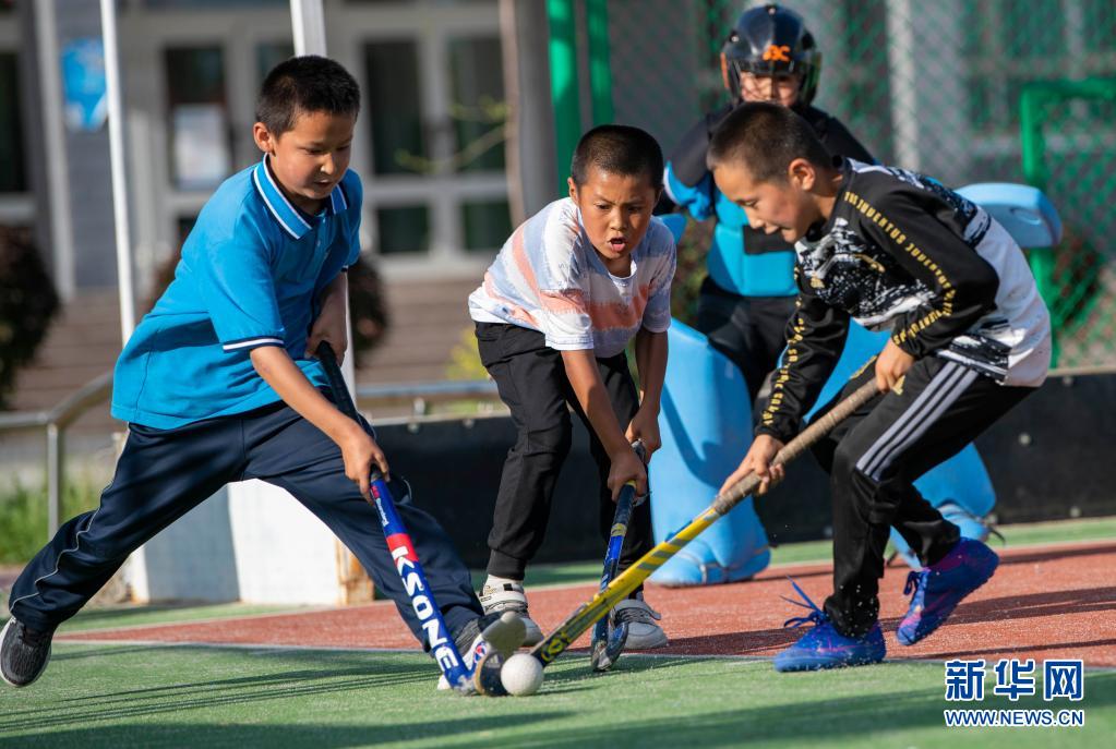 塔城市第二小學曲棍球隊員加熱斯·努爾白拉提(前左)、申世豪(前中)與哈爾肯·夏里甫在隊內訓練賽中拼搶(6月11日攝)。