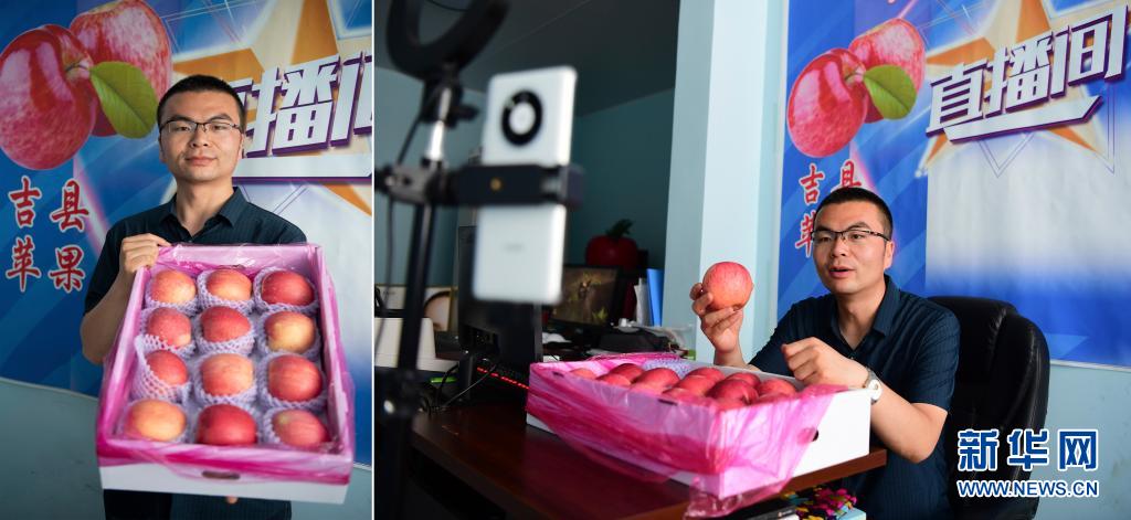 拼版照片:左圖為郭豐瑞展示山西省吉縣產(chǎn)的蘋果;右圖為郭豐瑞通過網(wǎng)絡(luò)直播介紹蘋果(7月9日攝)。今年31歲的郭豐瑞是吉縣南村人,曾在北京打工的他看到農(nóng)村電商的巨大潛力后,于2013年返鄉(xiāng)創(chuàng)業(yè)。2014年,郭豐瑞成立了合作社,同時(shí)開始線上銷售蘋果。隨著網(wǎng)絡(luò)直播熱潮的興起,郭豐瑞開始通過各個(gè)直播平臺宣傳家鄉(xiāng)的優(yōu)質(zhì)蘋果。