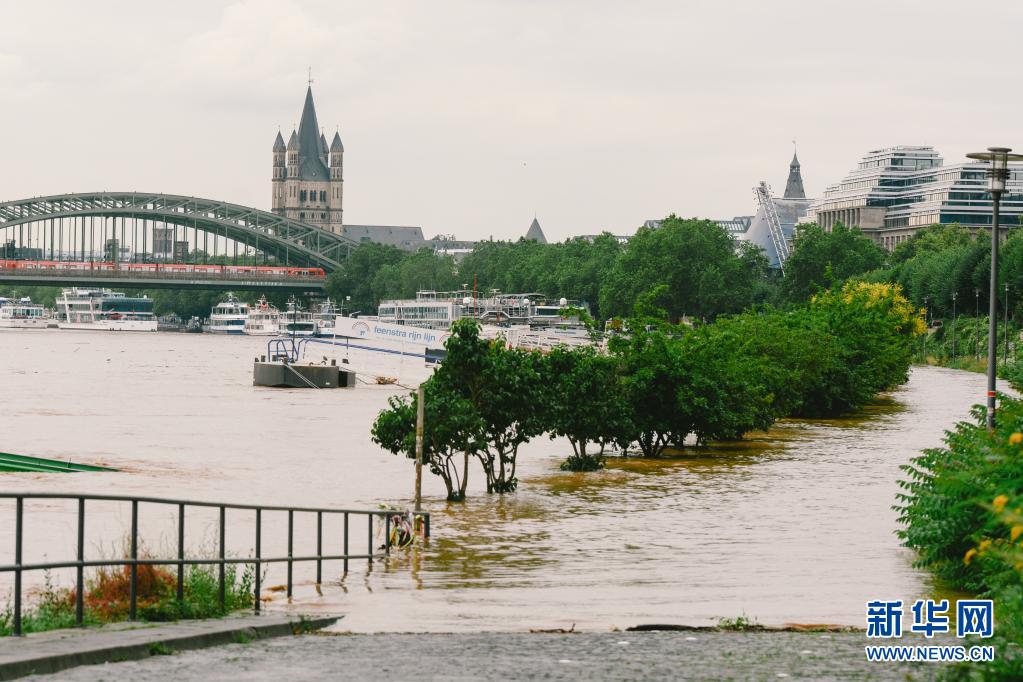這是7月15日在德國(guó)西部城市科隆拍攝的水位上漲的萊茵河。