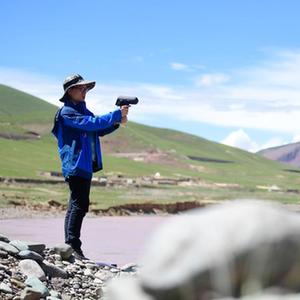 2021年長江源綜合科考的科考隊員任斐鵬在長江南源當曲地區觀察高寒草甸(7月23日攝)。