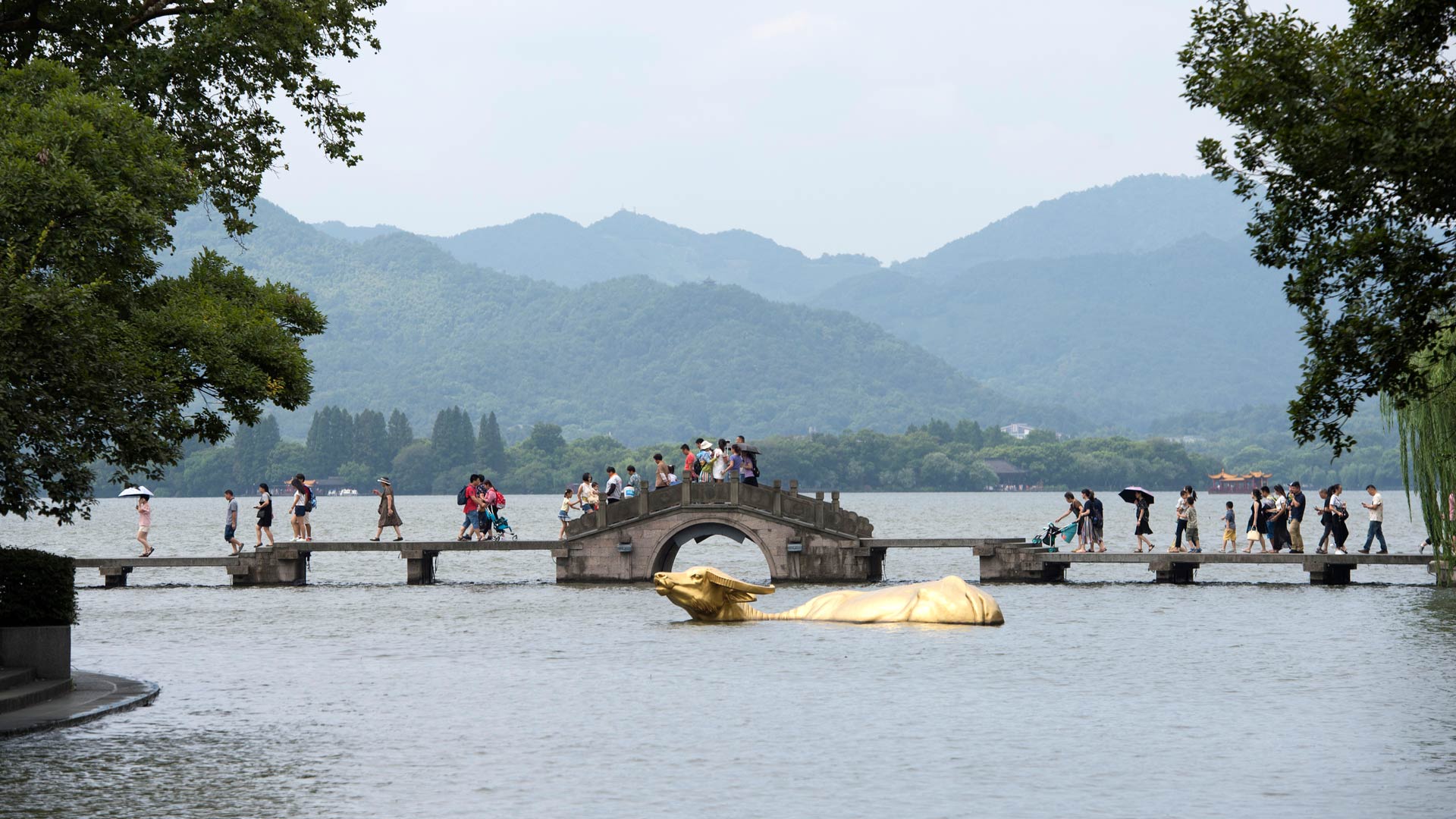 這是4月11日航拍的西湖景區蘇堤。2001年開始,杭州按“申遺”目標,對西湖進行了全方位的保護和整治。西湖南線各大公園打通,形成“十里環湖景觀帶”。龍井八景修復,慧因高麗寺重現,南宋官窯博物館擴建,八卦田遺址得到保護,還有飛來峰石刻造像、雷峰塔遺址、龍井寺……(新華社記者 黃宗治攝 )