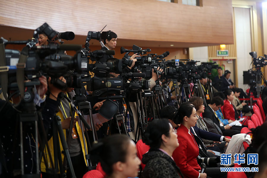 10月22日,十九大新聞中心在梅地亞中心二層新聞發(fā)布廳舉辦集體采訪活動,邀請教育領(lǐng)域代表談“教育綜合改革”。圖為集體采訪活動現(xiàn)場。新華網(wǎng) 郝廣鵬攝