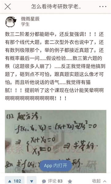 昨天上午,多名網(wǎng)友發(fā)微博爆料稱,2018年全國(guó)碩士研究生統(tǒng)一招生考試數(shù)學(xué)科目出現(xiàn)“神押題”,一位名為“李林”的教師在考前押題視頻中舉的例題與實(shí)際考研的考試試題十分相似。網(wǎng)友指出,李林押題“命中率”高達(dá)80%,甚至連超綱的二階差分都反復(fù)強(qiáng)調(diào)。“每年押中幾個(gè)題已經(jīng)很牛了,這位老師押中線代大題原題、證明題原題也就罷了,連超綱的二階微分都猜中,并且反復(fù)強(qiáng)調(diào)。”
