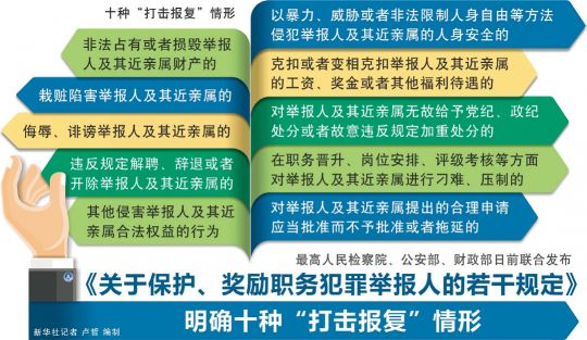 “舉報人的舉報行為可能會使違法者面臨較大數額的罰金甚至刑事處罰,因此,被舉報者可能會對舉報人及其家人進行或明或暗的報復。”杜立元說。內部舉報人往往是企事業單位職工、公務員等,如果保護機制不健全,就可能遭遇調換崗位等隱性報復行為。舉報人如何尋找申訴部門、如何對遭到打擊報復的舉報人進行救濟等,都是亟需解決的問題。