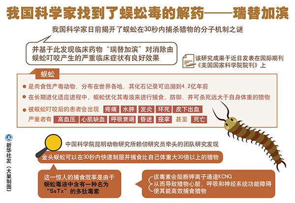 圖表:我國科學家找到了蜈蚣毒的解藥——瑞替加濱 新華社發 大巢制圖