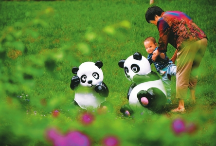 2月3日,冬日的陽光明艷無比,成都三環路嬌子立交至航天立交外側,濃密的樹叢里,一條灰磚小道在草地里蜿蜒。周圍散落的是各種熊貓的雕塑,有彩色的,也有用植物打造的。