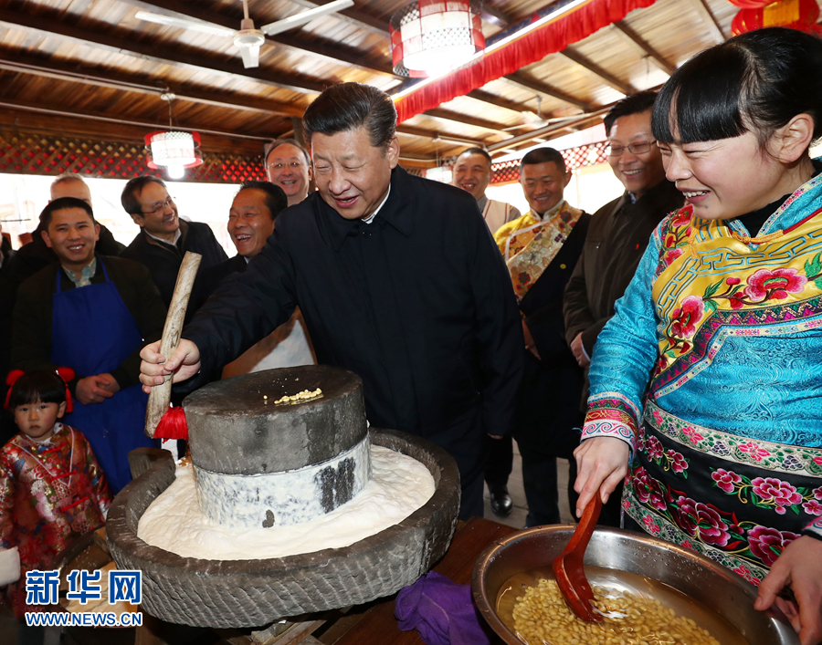 這是2月12日上午,習近平在阿壩藏族羌族自治州汶川縣映秀鎮考察時同居民群眾一起磨豆花。 新華社記者 鞠鵬 攝