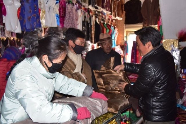 今年的藏歷新年和春節(jié)“喜相逢”。月初,同德縣城老城區(qū)車水馬龍,處處洋溢著過年的喜慶氣氛,擁擠的街道兩旁擺滿了各式各樣的商品,各族群眾忙著購置年貨。老旦正忙著打理自己的藏服店,十幾種藏服款式,吸引著一撥撥的客人惠顧,讓他幾乎沒有空閑和記者聊天。他說,這段時(shí)間每天的毛收入都在萬八千的。“客人多的時(shí)候連午飯都顧不上吃!”