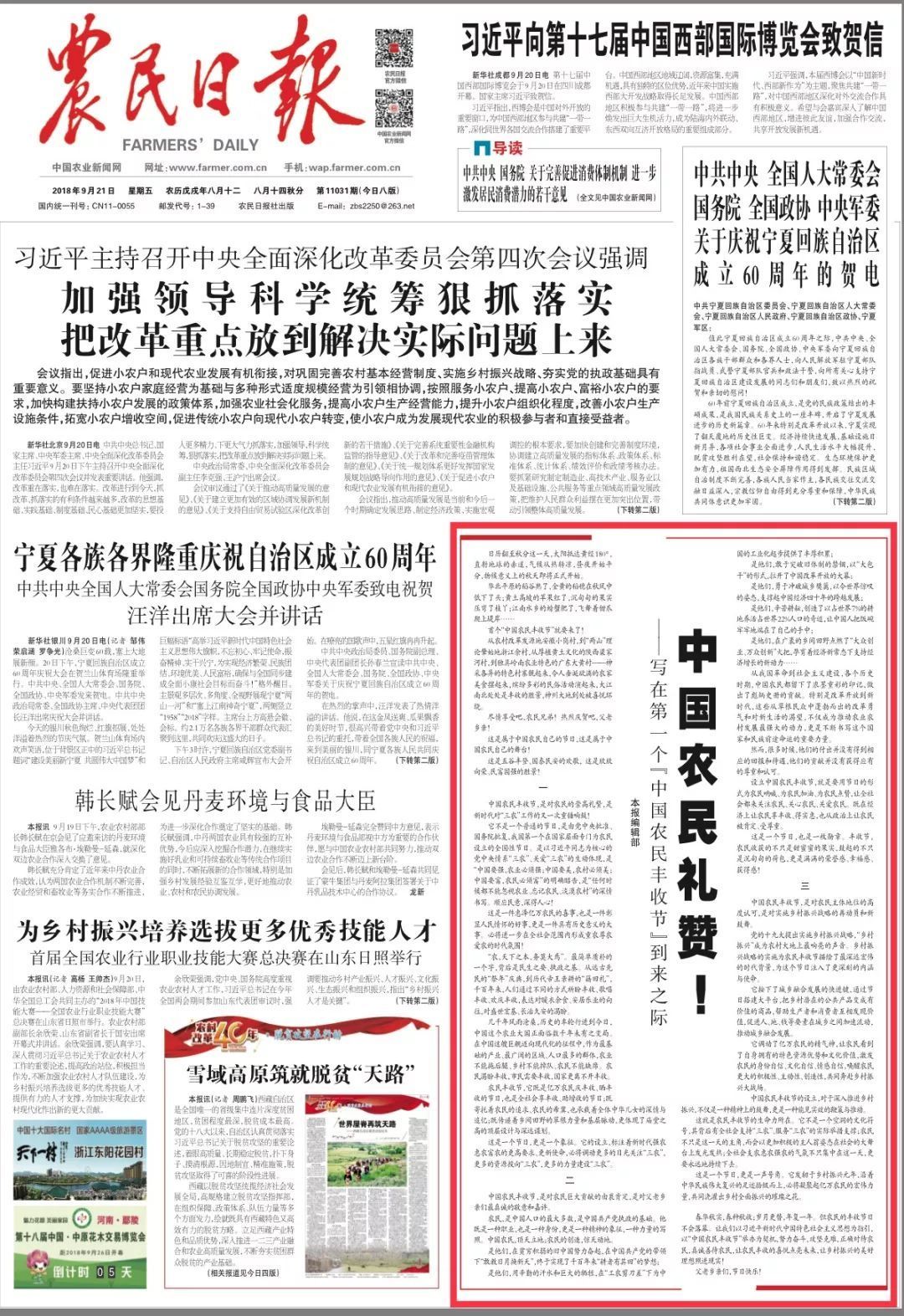 它不是一個普通的節(jié)日,是由黨中央批準、國務(wù)院批復(fù),我國第一個在國家層面專門為農(nóng)民設(shè)立的全國性節(jié)日。是以習近平同志為核心的黨中央情系“三農(nóng)”、關(guān)愛“三農(nóng)”的生動體現(xiàn),是“中國要強,農(nóng)業(yè)必須強;中國要美,農(nóng)村必須美;中國要富,農(nóng)民必須富”的明確昭告,是“任何時候都不能忽視農(nóng)業(yè)、忘記農(nóng)民、淡漠農(nóng)村”的深情書寫。順應(yīng)民意,深得人心!