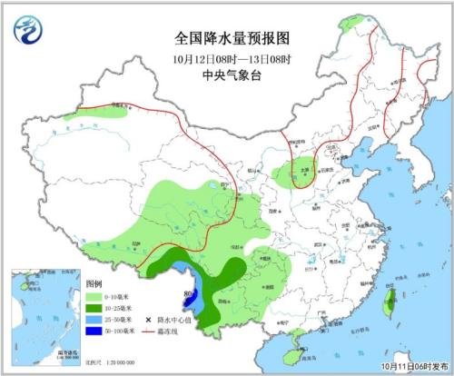 10月11日08時至12日08時,黑龍江東南部、吉林東部、新疆西部、西藏北部和東部等地有小到中雨(雪)或雨夾雪;西北地區東部、四川南部、云南大部、貴州西部、華南東部、海南島和臺灣島等地部分地區有小到中雨,其中,云南西部、海南島南部、臺灣東北部等地局地有大雨或暴雨(50~70毫米)。內蒙古中部、遼東半島、山東半島等地部分地區有4~6級風。臺灣海峽將有7~8級、陣風9級的東北風。