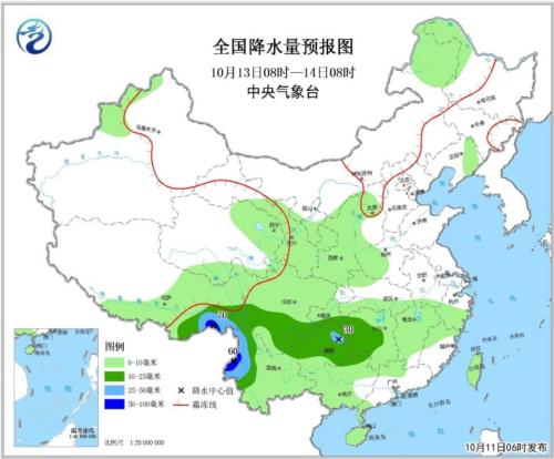10月13日08時至14日08時,內蒙古東北部、黑龍江西北部、青藏高原東部等地有小雨(雪)或雨夾雪;遼寧東部、西北地區東部、山西中西部、河南西部、江漢北部和南部、江南大部、西南地區、華南北部和西部、海南島和臺灣島等地部分地區有小到中雨,其中,西藏東南部、貴州東北部和云南西部等地局地有大雨或暴雨(50~70毫米)。