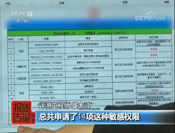 評測工程師 盛大江:我們這次測試權限的主要方向,涉及了兩個方面。第一個是權限的授權方式,決定了用戶是否知情并且有選擇權。第二個是這些權限是否有對應的功能。 我們發(fā)現(xiàn)在18款應用中,有14款應用有25個敏感權限,沒有找到對應的功能。這25個權限主要分布在電話權限、短信權限、定位權限,日歷、附件之類的權限上。