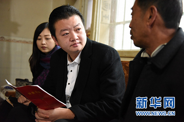 四川省敘永縣后山鎮(zhèn)三斗米村駐村第一書記胡凌鳴(右一)在貧困戶趙世蓮(右二)家了解脫貧進展情況(1月15日攝)。新華社記者 陳天湖 攝