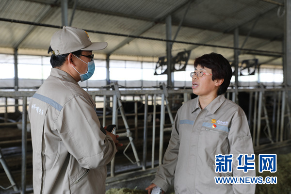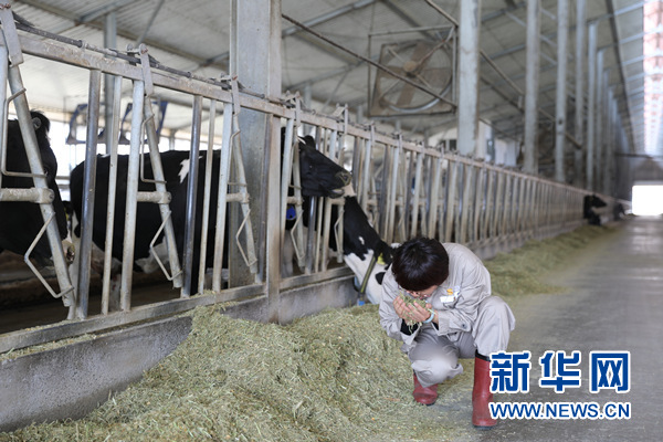 圖為叢慧敏在檢查奶牛吃的飼料。新華網汪亞/攝