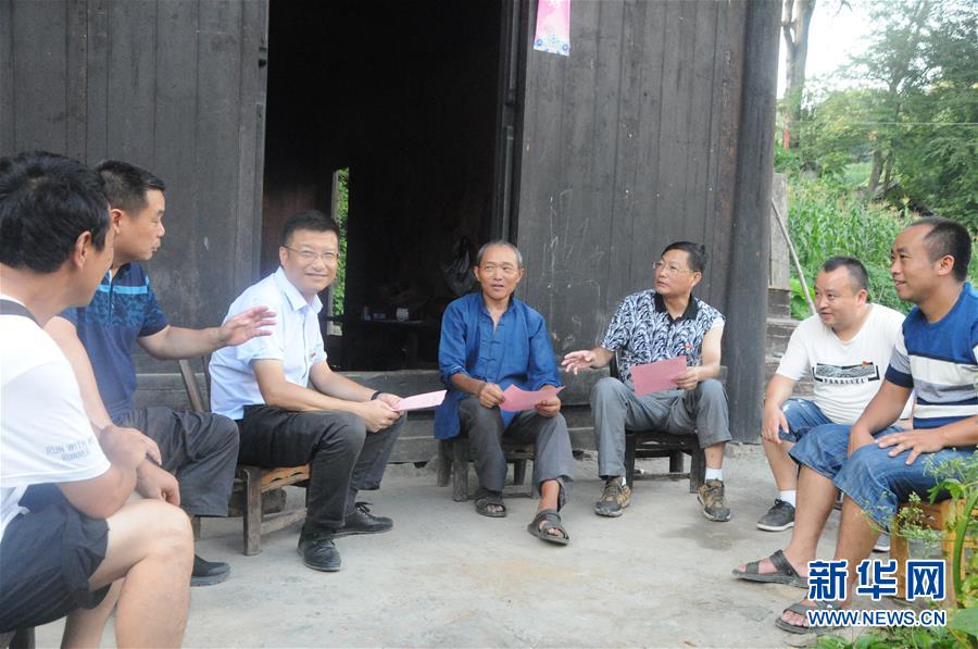 干部在湖南省古丈縣翁草村貧困戶龍自立家介紹安吉“白葉一號”項目情況(2018年7月11日攝)。新華社發