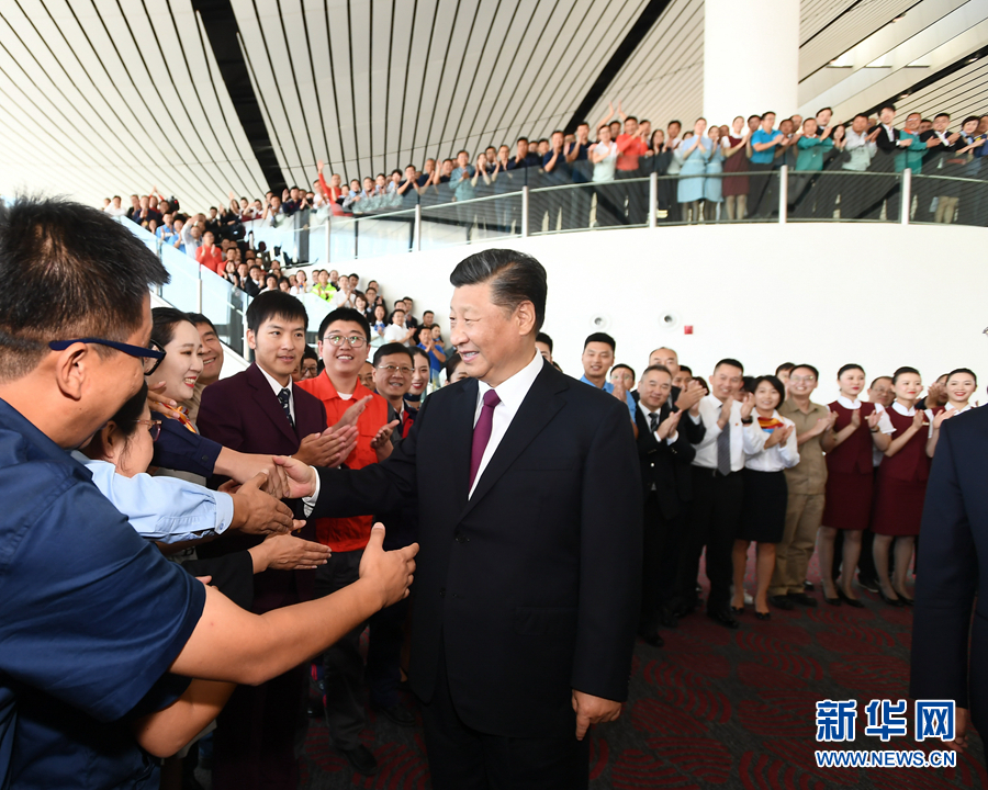 9月25日上午,北京大興國際機(jī)場投運(yùn)儀式在北京舉行。中共中央總書記、國家主席、中央軍委主席習(xí)近平出席儀式,宣布機(jī)場正式投運(yùn)并巡覽航站樓。這是習(xí)近平看望參與機(jī)場建設(shè)和運(yùn)營的工作人員代表,同他們親切交談。 新華社記者 謝環(huán)馳 攝