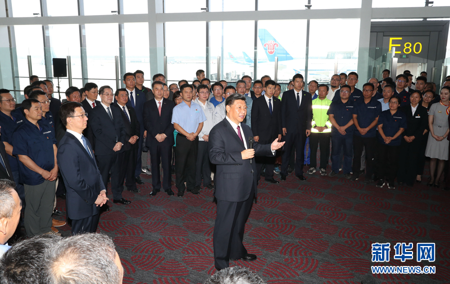 投運(yùn)儀式在機(jī)場聯(lián)檢大廳舉行。11時許,伴隨著歡快的迎賓曲,習(xí)近平等步入儀式現(xiàn)場,全場起立鼓掌。
