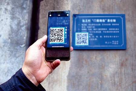 2018年10月22日,衢州市龍游縣東華街道張王村的工作人員通過“龍游通”掃描住戶門前二維碼了解信息 韓傳號(hào)攝
