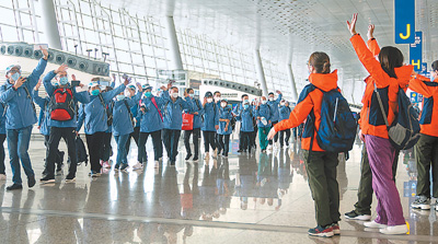 3月17日,在武漢天河機場,山東國家緊急醫學救援隊隊員(左側)向江蘇國家緊急醫學救援隊隊員揮手致意。新華社記者 熊琦攝