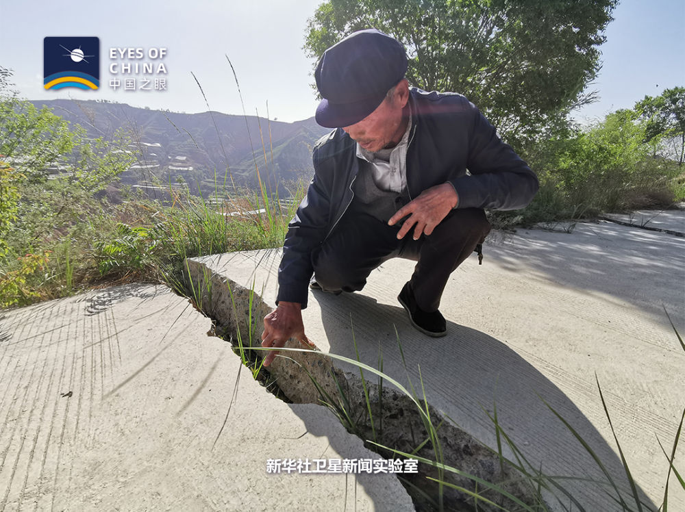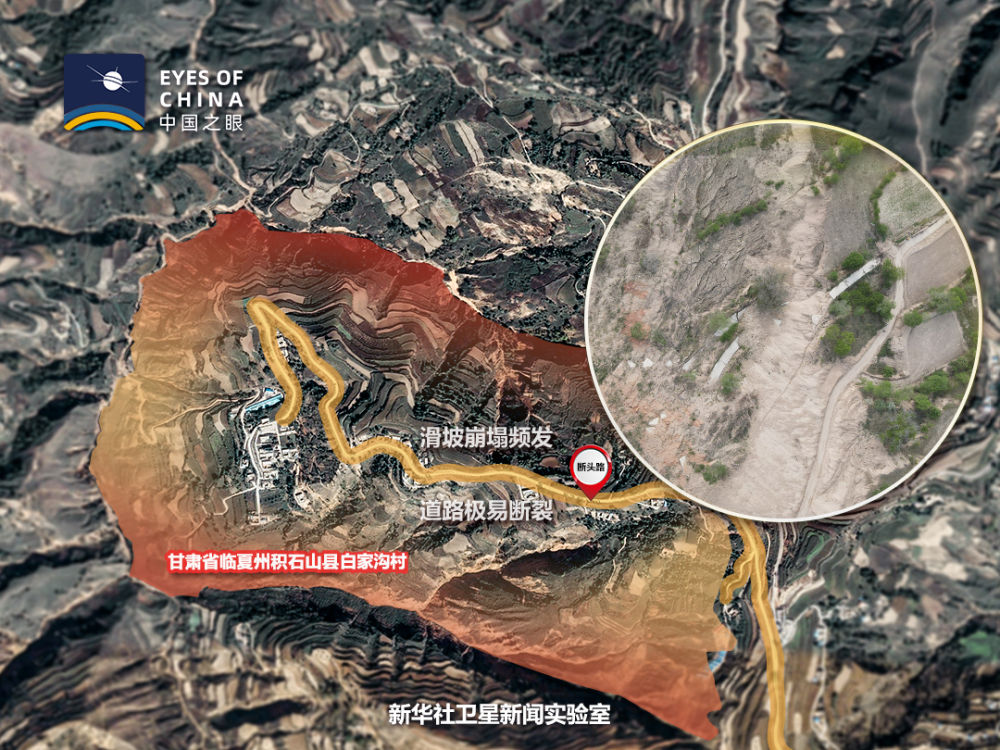 白家溝村地處濕陷性黃土滑坡帶。從衛(wèi)星看,整個(gè)村子山峰陡峭,基巖裸露,難以找到一塊成片的平地。人只能見(jiàn)縫插針式地居住在疏松、干裂的黃土地上。一條崎嶇的路像絲帶一樣“搭”在懸崖峭壁上,隨時(shí)有掉下來(lái)的危險(xiǎn)。