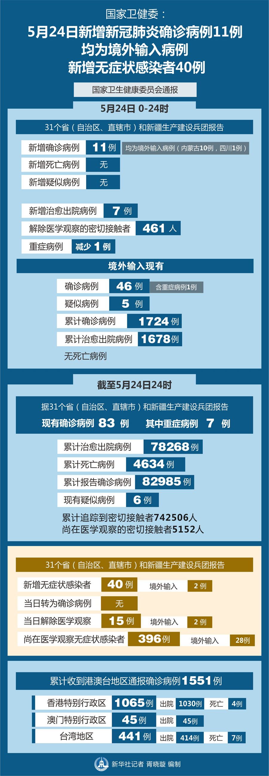 新華社北京5月25日電(記者王秉陽)國家衛健委25日通報,5月24日0-24時,31個省(自治區、直轄市)和新疆生產建設兵團報告新增新冠肺炎確診病例11例,均為境外輸入病例(內蒙古10例,四川1例);無新增死亡病例;無新增疑似病例。