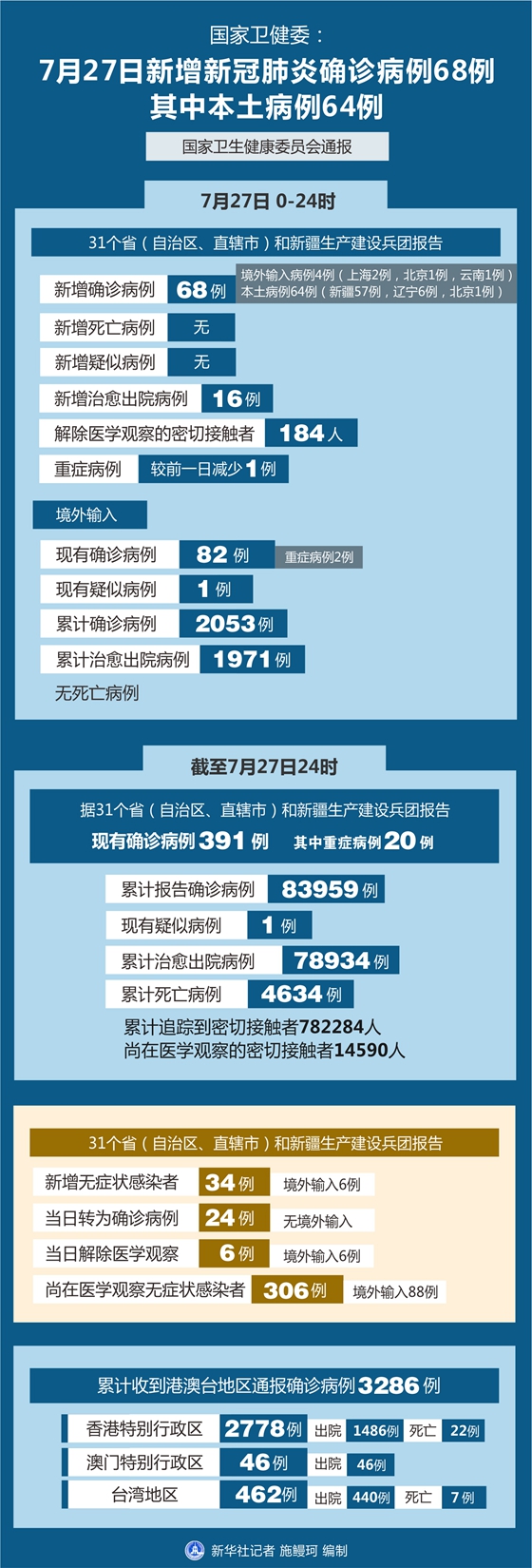新華社北京7月28日電 國(guó)家衛(wèi)生健康委員會(huì)28日通報(bào),7月27日0—24時(shí),31個(gè)省(自治區(qū)、直轄市)和新疆生產(chǎn)建設(shè)兵團(tuán)報(bào)告新增新冠肺炎確診病例68例,其中境外輸入病例4例(上海2例,北京1例,云南1例),本土病例64例(新疆57例,遼寧6例,北京1例);無新增死亡病例;無新增疑似病例。
