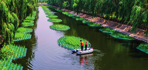 河北省雞澤縣在河道治理中采用“生態浮島”技術,種植挺水植物,既美化了河道,又凈化了水體,達到了生態治污效果(6 月 20 日攝)王曉攝